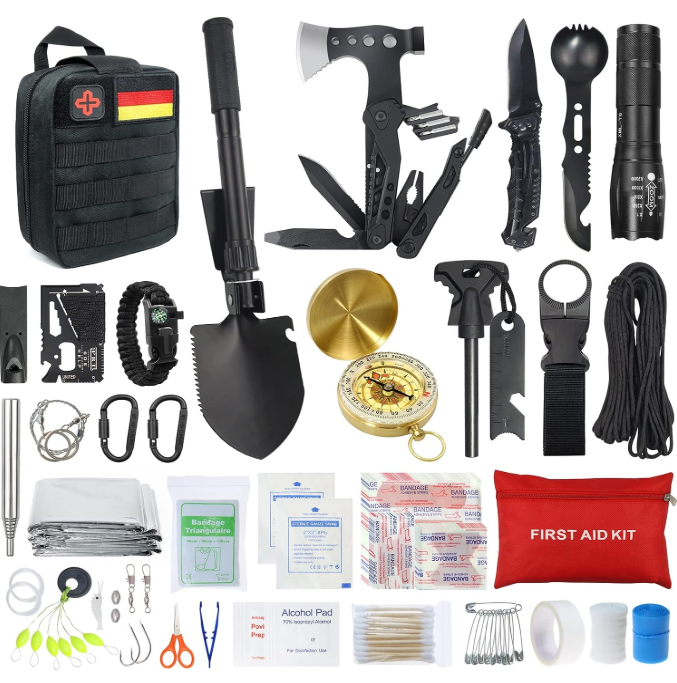 - Was es ist: Ein All-in-one-Survival-Bundle mit Erste-Hilfe-Beutel, Tools und Zubehör (u.a. Wasserfilter-Stroh, Multifunktions-Tool mit Hammer/Axt) in einer kompakten Tasche.